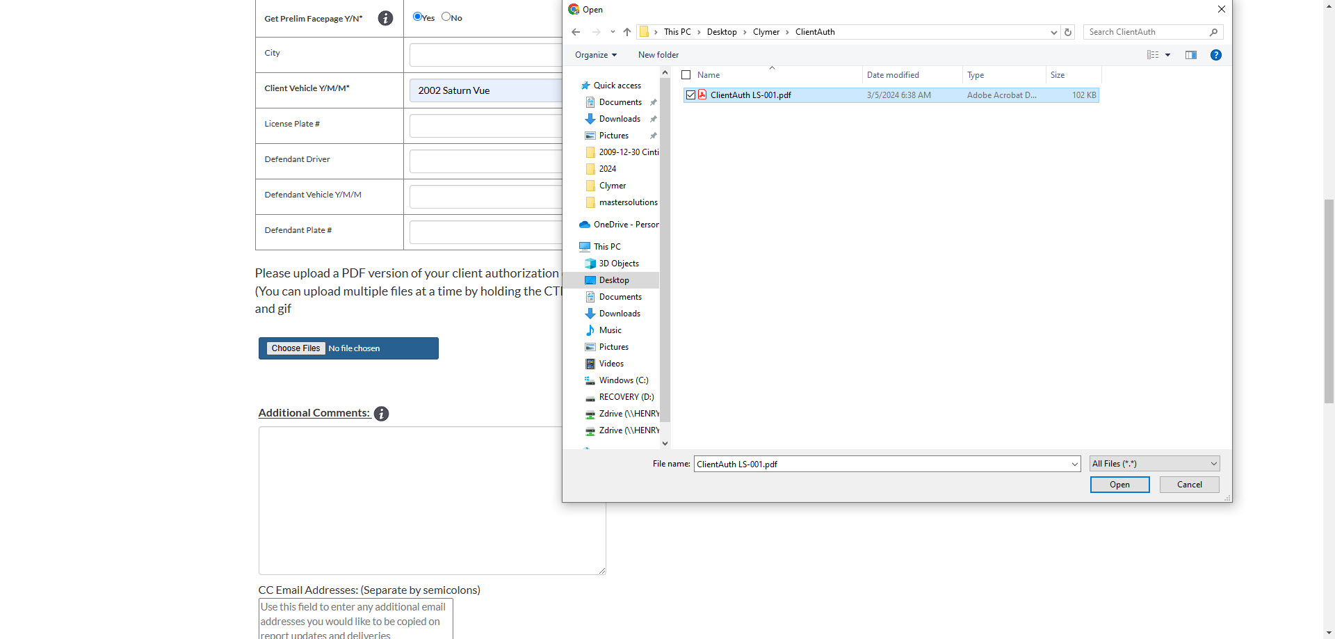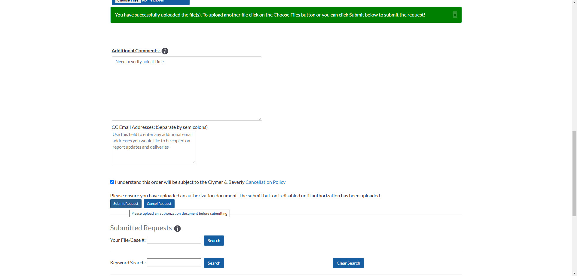If an Authorization is required from your client, you can upload it as part of the entry. Almost all Report Requests require a client authorization, and we can help you define the most effective template for 3rd party request.